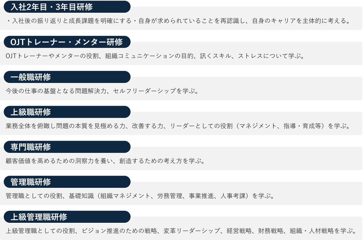 その他にも、各社員の段階に応じた階層別の研修を準備しています。